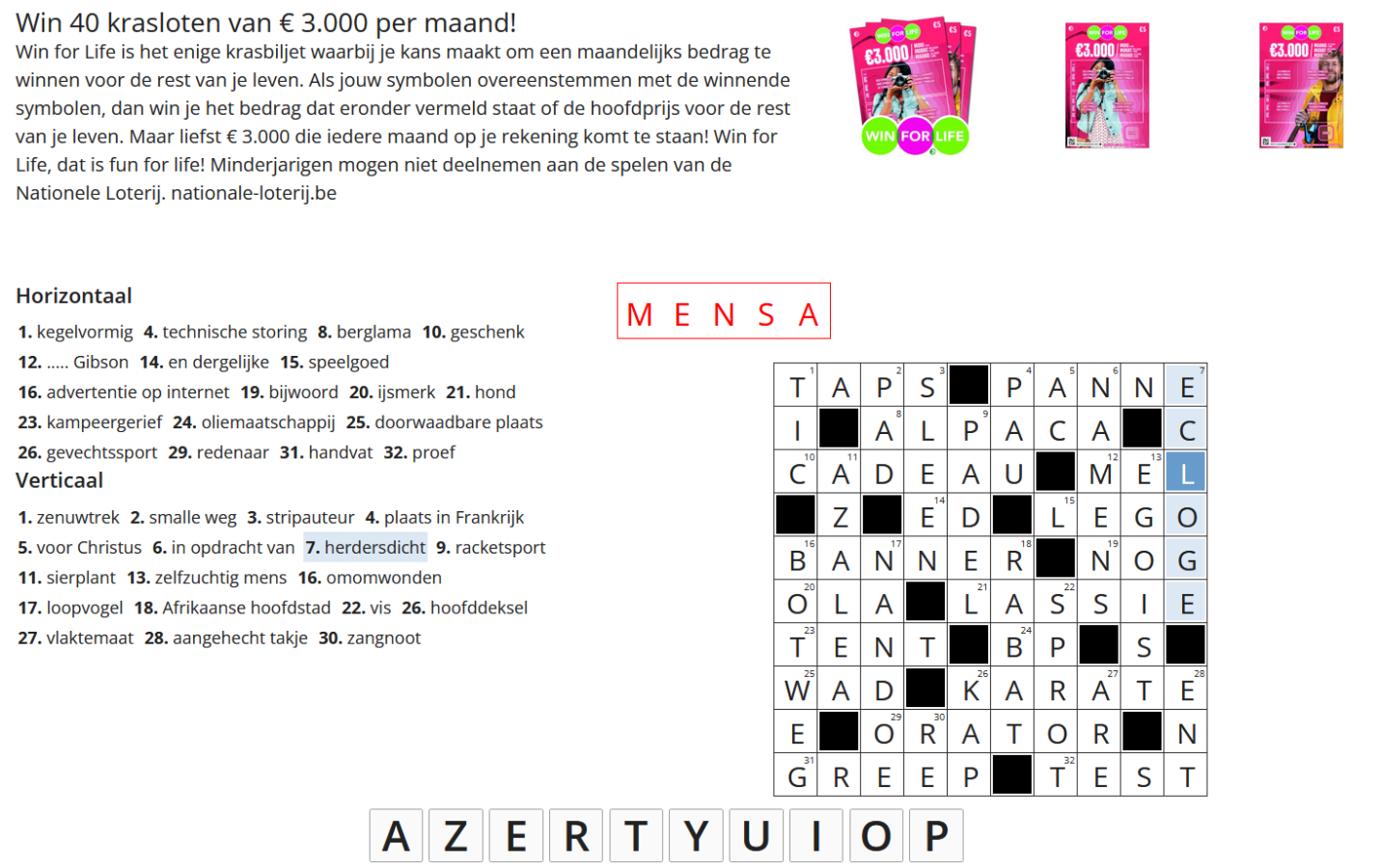 Los het Kruiswoordraadsel op en Win 40 Win For Life krasloten van De Nationale Loterij. Puzzel mee op Puzzeclib.be en maak kans op Prachtige Prijzen. -