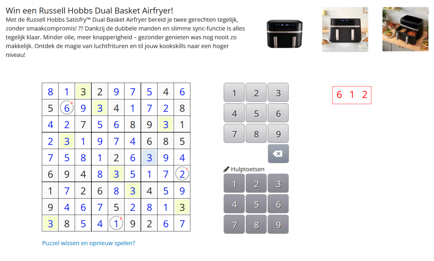 Los de Sudoku op en Win een Russel duo Airfryer. Puzzel mee pop Puzzelclub.be en maak kans op Prachtige Prijzen. -